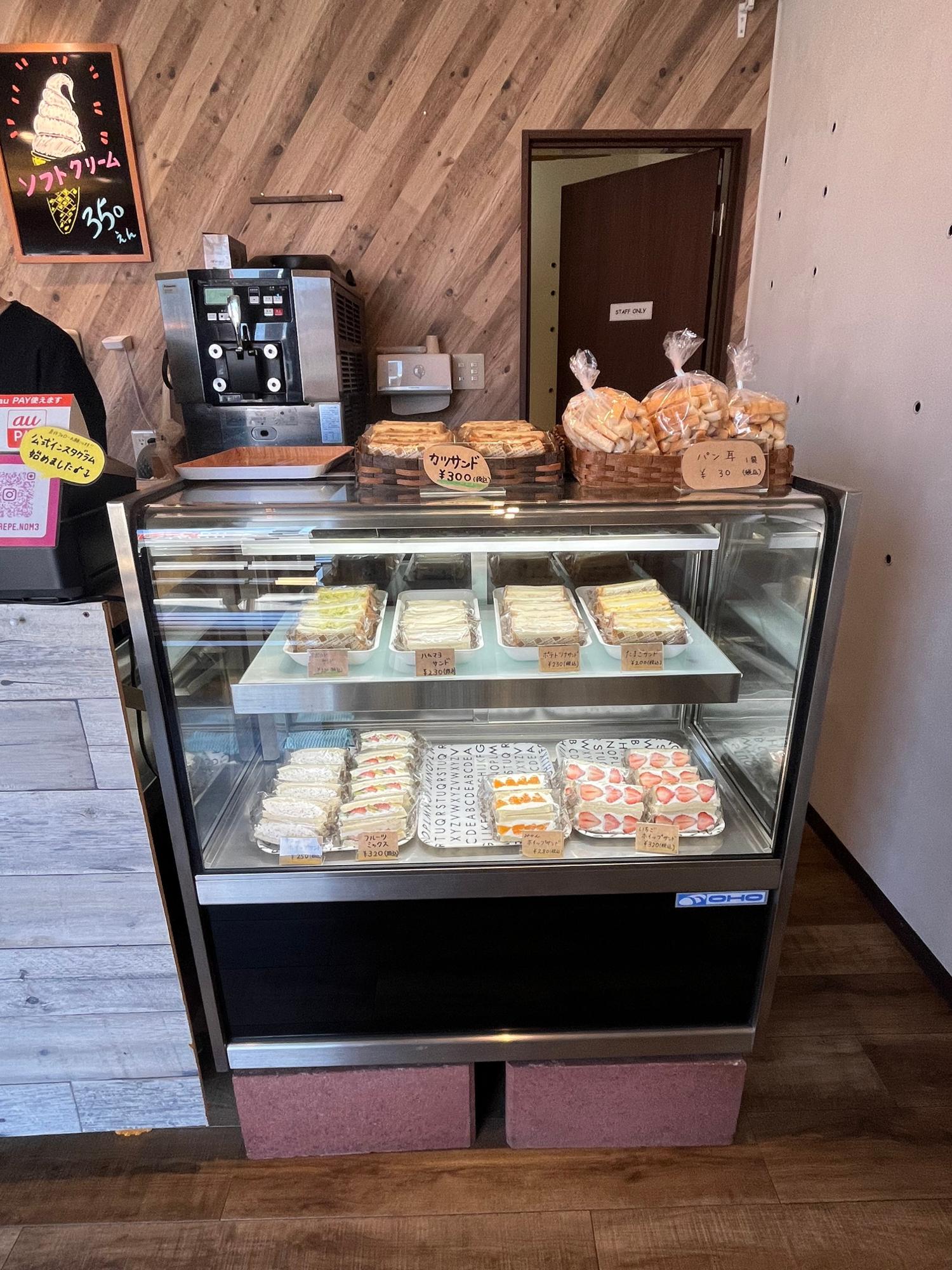 【札幌市東区】お客さんが途切れないクレープとサンドイッチのお店「nom3」。 サンドイッチのショーケースにはイチゴやミカンなどのフルーツ系や、カツ、ツナポテトなどの食事系のサンドイッチが並んでいます。