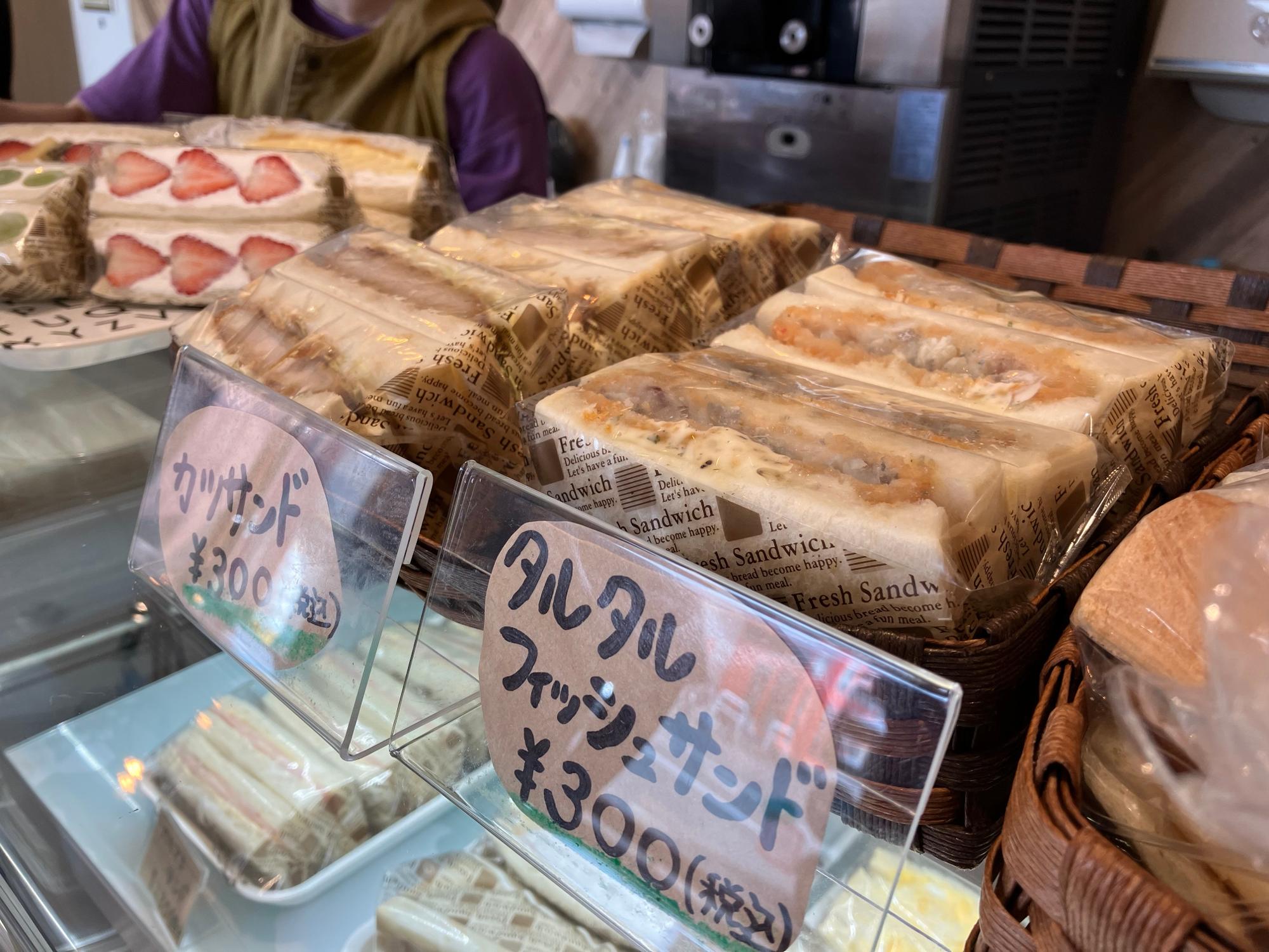 サンドイッチのショーケースにはイチゴやミカンなどのフルーツ系や、カツ、ツナポテトなどの食事系のサンドイッチが並んでいます。